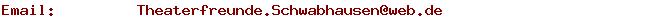Jörg Appel aus 97944 Boxberg-Kupprichhausen schrieb am 11.12.2018 um 02:30:54 Uhr: Liebe Besucher der Homepage von den Theaterfreunden Schwabhausen, leider ist unser altes Gästebuch nicht mehr erreichbar. Deshalb haben wir dieses neue Gästebuch auf unserer Seite implementiert. Wie das alte dient auch das neue Gästebuch zur Erfassung eurer Kritik, Feedbacks und Anregungen sowohl zur Seite als auch zu unseren Stücken. Wir freuen uns schon auf eure Beiträge.